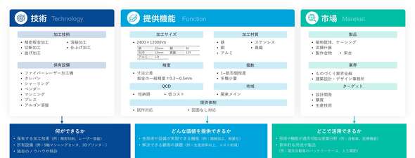 加工設備や技術そのものに関する顧客の関心を把握する。たとえば以下のような項目を分類する。