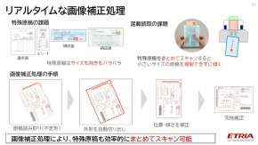 中でも画像向き自動補正技術については、要件が異なる業務用イメージスキャナーと複合機を融合するためにリアルタイムで行えるように工夫をこらした。SDシリーズのADFは、不定形サイズの帳票や複写紙、カード類などの読み取りに対応しているが、これらはサイズも向きもバラバラであり、一括読み取り時に傾くことも多い。この不定形の原稿を読み取った上で外形を自動で切り出し、位置や傾き、天地を補正するという一連の画像補正処理をエッジAIアルゴリズムによってリアルタイムに行っている。