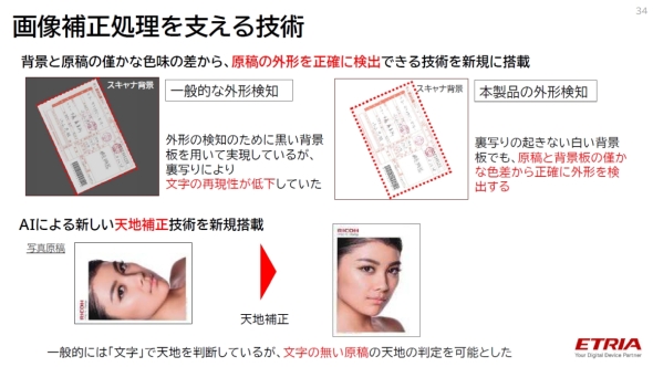 この画像補正処理では、OCRの文字再現性低下の原因となる裏写りが起きない白い背景板でも、背景と原稿のわずかな色味の差から原稿の外形を正確に検出できるAI技術を新たに搭載した。また、一般的に文字で判断している天地補正についても、文字のない写真のような原稿でも天地判定を行える。