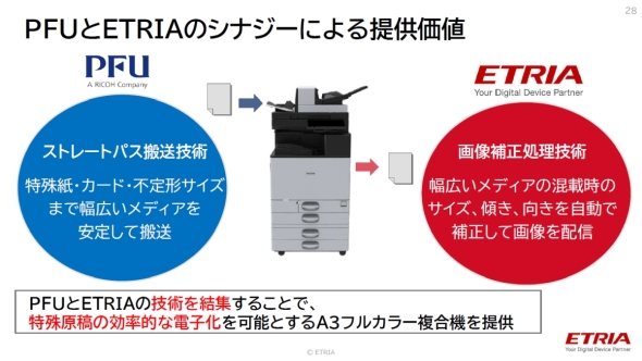 SDシリーズの複合機としての開発を担当したのは、2024年7月にリコーと東芝テックの出資で発足したエトリアである。エトリア 執行役員 BSP本部 OC事業センター 所長の佐藤訓之氏は「今回の新製品はPFUとエトリアのシナジーによる提供価値の一つになる。PFUがリコーグループに加わった段階から開発を進めてきた。今後もエトリアとして、リコーとPFU、そして東芝テックの技術も融合して競争力の高い複合機などのハードウェアを開発していきたい」と述べている。