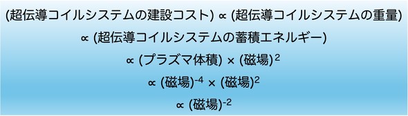 超伝導コイルシステムの電磁力支持構造物を含めた重量は、コイル全体の蓄積エネルギーにほぼ比例します[参考文献5]。コイル蓄積エネルギーは、教科書で学んだように、(1/2)×(インダクタンス)×(電流)2で表されます。また、核融合炉の場合、コイルの蓄積エネルギーはおおよそ、プラズマの体積とコイルが発生する磁場の二乗に比例します。