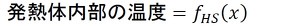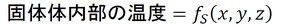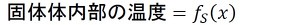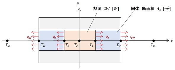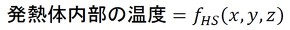 図2を基に、発熱体と固体の温度分布を考えます。発熱体の温度が高く、固体が流体に接する面の温度が低くなると推測されます。よって、温度は座標の関数として表すことができる……というか、この関数を求めることが目的です。関数は次式で表されます。