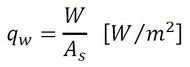 ここで、大切な量である熱流束を説明します。記号はqです。単位面積(例えば、1[m2]です)を通過する熱量で、単位は[W/m2]となります。図3の熱流束を求めましょう。熱源の発生熱量を2W[W]とすると、図3は左右対称なので、右方向に流れる熱量はその半分のW[W]です。固体の断面積をAs[m2]とすると、熱流束は式5で表されます。