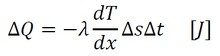 このとき、固体内部の小さな平面を考え、そこを短い時間Δt[s]の間に通過する熱量をΔQ[J]とします。小さな平面の面積をΔs[m2]、温度分布を座標xの関数T(x)とすると、これらには以下の関係があります。これがフーリエの法則です。