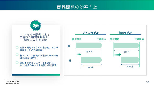 ファミリー開発の最初のモデルは2026年度に発売する。進行中のプロジェクトにも適用し、2025年度からコスト削減効果を生み出すとしている。また、外部委託開発の最適化やコスト効率の高い拠点の活用なども推進する。