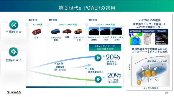 燃費を大幅に改善する第3世代の「e-POWER」も2025〜2026年度に複数車種で投入する。「キャシュカイ」「ローグ」や大型ミニバンに順次展開する。初代e-POWER比で20%のコスト削減も実現し、収益と成長に貢献するとしている。e-POWERは米国にも投入する。また、2026年度までに独自のインテリジェントコックピットや新たな運転支援技術を新型車に導入する。