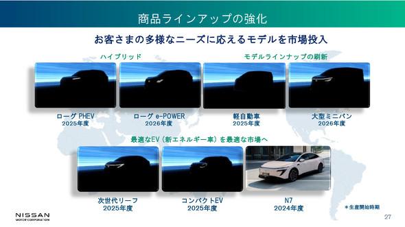 2025〜2026年度はプラグインハイブリッド車(PHEV)の新モデルを投入する他、日本向けの軽自動車や大型ミニバンの新型車を発売する。次世代の「リーフ」やコンパクトEV、中国向けの新エネルギー車などEVの新型車ラインアップも強化する。