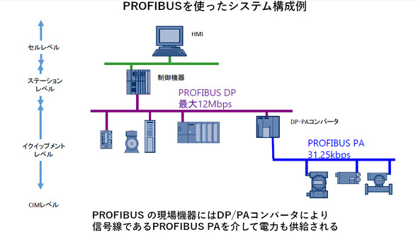 しかし、1984年からの標準化活動がFieldbus Foundationに引き継がれてもなかなか仕様がまとまらなかったことから、Siemensを中心としたプロフィバス協会がFA用フィールドバスであるPROFIBUS DPの通信仕様と討議中のPA用フィールドバスの物理層をまとめる形で、1996年にPROFIBUS PAとよばれるプロセス用フィールドバスを発表しました。図1にPROFIBUSを使ったシステム構成例を示します。