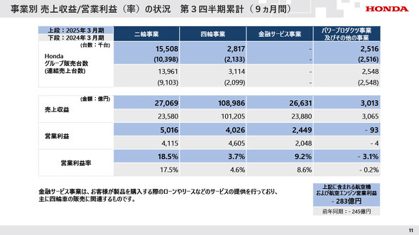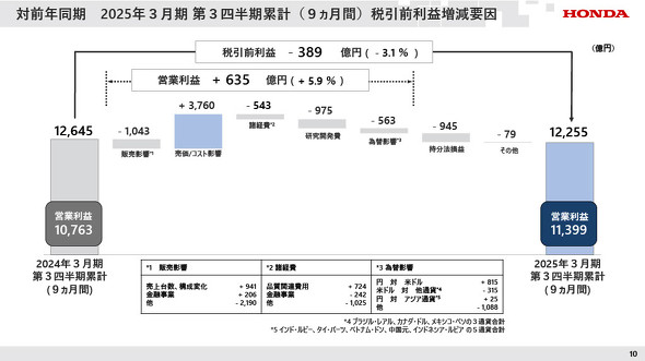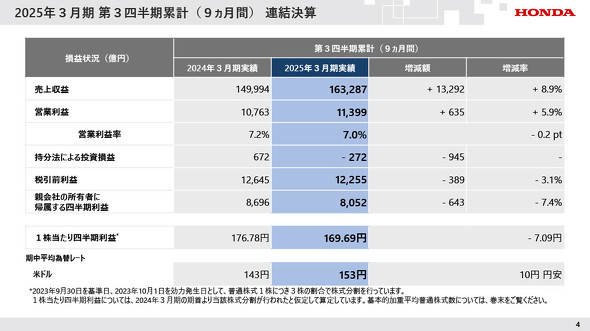 ホンダが2025年2月13日に発表した2024年4〜12月期(2025年3月期第3四半期)決算は、売上収益(売上高)が前年同期比8.9%増の16兆3287億円、営業利益が同5.9%増の1兆1399億円、親会社の所有者に帰属する四半期利益(当期純利益)が同7.4%減の8052億円だった。