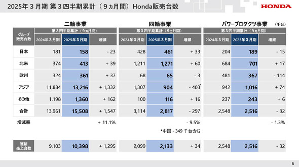 二輪事業はアジアをはじめグローバルで販売が好調に推移した。インドやブラジルでの需要が堅調だった他、ベトナムでの景気回復などが寄与した。四輪事業は、北米での販売が堅調だったが中国を中心にアジアで減少したのが響いた。四輪事業の小売り実績は米国は前年同期比6.5%増の109万台、日本は同13.4%増の48.5万台、中国が同36.3%減の64.5万台だった。