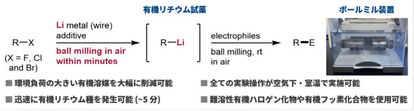 有機リチウム試薬は、その反応性の高さから、有機合成で広く利用されている。今回の研究で、有機溶媒の使用を大幅に削減し、かつ実験操作が簡便になったことで、環境調和型の新しい物質生産プロセスの開発が期待される。