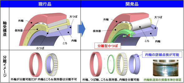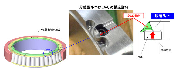 分離構造化については、内輪の小つばを取り外し可能な構造にすることにより、ころ、保持器と内輪の分離を可能にし、全部品の詳細点検が可能な仕様にした。分離型小つばと内輪はボルトで締結している。万が一のボルトの脱落を防ぐため、締結部にかしめ構造を設けており、鉱山現場など振動が作用する使用環境での信頼性を向上した。