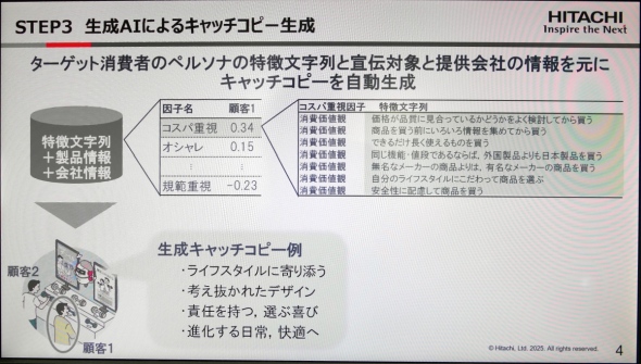 一方、「キャッチコピー生成システム」は、データ分析と生成AIの組み合わせによって実現している。まず、広告ターゲットの購買履歴やアンケート結果、基本属性などからクラスタリングの手法を用いて内的特徴を数値化する。次に、この広告ターゲットと似た特徴を持つ集団を特定し、データ分析により高い広告効果が見込める宣伝対象となる商品を選定する。そして、広告ターゲットの数値化された内的特徴にひも付く特徴文字列と、宣伝対象となる商品と提供会社の情報を生成AIに入力してキャッチコピーを自動生成する。