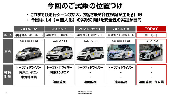 日産自動車はモビリティサービスの実用化に向けて、運転席が無人の状態での公道走行の様子を公開した。