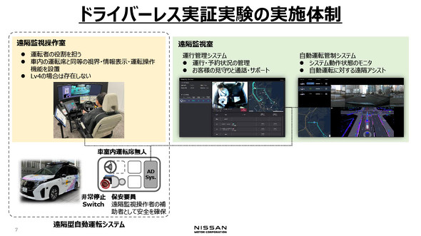「遠隔操作者は運転できるがほぼ何もしない状態だ。レベル2の体制で実施するが、実質的にはレベル4だ」(日産自動車 総合研究所 モビリティ&AI研究所 エキスパートリーダーの木村健氏)。