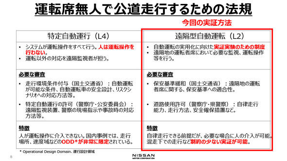 レベル2に相当する遠隔型自動運転は必要なときに人が介入できるため、レベル4の「特定自動運行」と比べて実証の制約が少ないという特徴がある。特定自動運行はシステムが運転操作を全て行い、人は運転操作に介入できない。運転以外の対応には遠隔監視者が対応する。