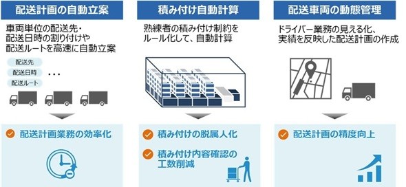 具体的には、これまで現場のノウハウに頼っていた、配送先や配送日時の割り付け、配送ルート策定などの配送計画を自動で立案する。配送計画は日々の物量や納期に応じて最適化する。