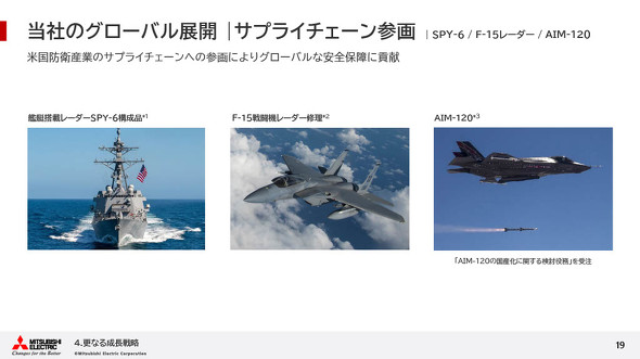 米国でのグローバルサプライチェーン参画では、艦艇搭載レーダー「SPY-6」の構成品の供給契約を米国のRTXと締結した。また、RTXとはF-15戦闘機のレーダー修理でも三菱電機の修理能力を確認するための試験的な契約を結んでいる。三菱電機は2004年からRTXと製造委託契約を結んでおり、航空自衛隊のF-15戦闘機のレーダーをライセンス生産している。レーダーの修理も防衛省から請け負うなど実績がある。中距離空対空ミサイル「AIM-120」に関しては、国産化に向けた検討役務を日本の防衛省から受注した。