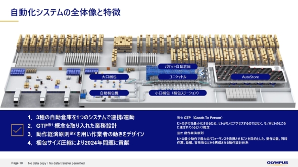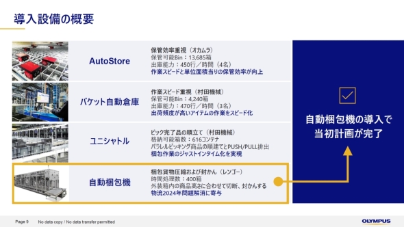 オリンパスの相模原物流センターにおける倉庫自動化プロジェクトが最終段階を迎えた。これまでに導入した3つの自動倉庫システムに加えて自動梱包ラインを構築したのだ。この自動梱包ラインは、コスト削減ではなく、貨物の絶対数と容積の圧縮を目標に掲げている。