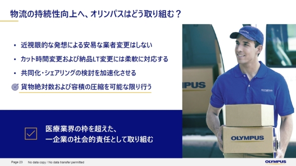 会見の冒頭では、2025年1月にオリンパスのSCM 日本地区統括に就任した大久保怜氏があいさつを行った。大久保氏は「相模原物流センターでは、2019年からSCM日本地区統括の前任である田中(亮氏)の下で倉庫自動化プロジェクトがスタートしたが、今回の自動梱包機の導入により一つのめどを迎えた。『医療を止めない物流』を目指してきたが、今後は物流2024年問題の解決などより幅広い課題の解決に取り組んでいく」と語る。