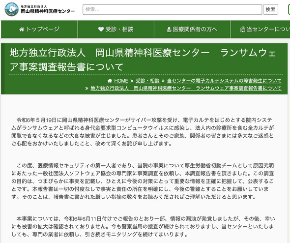 図1 岡山県精神科医療センター ランサムウェア事案調査報告書について(https://www.popmc.jp/home/consultation/er9dkox7/lromw3x9/)[クリックで拡大] 出所:岡山県精神科医療センター今回はこの渾身(こんしん)の報告書を読み解き、糧とすることでセキュリティに関する認識を変えていければと思います。