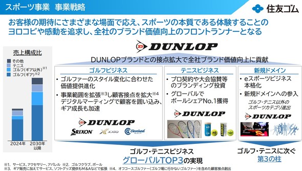スポーツ事業の戦略では、ゴルフビジネスやテニスビジネス、新分野に向けた展開を加速する。ゴルフビジネスでは、ゴルファーのスタイル変化に合わせた製品を提供するとともに、事業範囲を拡張し、ゴルフギアだけでなく関連のサービスやソフトグッズもM&Aなどで扱えるようにする。オフコースゴルファー(ゴルフ場に行かないゴルファー)を含めて顧客の接点創出も行う。デジタルマーケティングで顧客を囲い込み、ゴルフギアの事業成長も加速する。