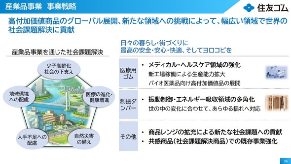 産業品事業の戦略では、医療用ゴム、制振ダンパーの展開を加速。医療用ゴムでは、新工場稼働による生産能力の拡大やバイオ医薬品向け高付加価値商品の展開で、メディカル/ヘルスケア領域を強化する。制振ダンパーでは振動制御やエネルギー吸収領域の多角化に合わせて製品を提供。また、少子高齢化社会や自然災害、人手不足、環境への配慮といった社会課題の解決する商品も販売し、既存事業を強化する。