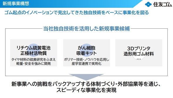 新規事業の構想に関して、ゴムの開発で培った独自技術を活用し、リチウム硫黄電池の正極材活物質やがん細胞吸着キット、3Dプリンタ造形用ゴム材料の事業化を検討している。リチウム硫黄電池正極材活物質はタイヤ材料の硫黄研究を踏まえ、軽量/安全を強みに開発し、がん細胞吸着キットは同社が持つポリマーの技術やノウハウを応用して産官学連携で実用化する考えだ。