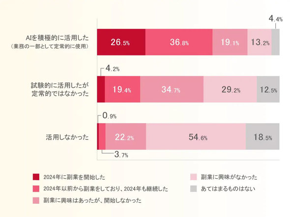 副業については、「AIを積極的に活用した」層は63.3%が既に副業を実施していた。「活用しなかった」層を見ると、54.6%が「副業に興味がなかった」と回答している。