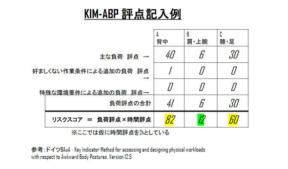 評価シートを見ていただければ分かる通り、イラストで分かりやすく描かれている姿勢サンプルを参考に、その姿勢の状態のデューティ比を勘案して評点を加算していきます。姿勢が無理したものであればあるほど、作業時間に対してその姿勢でいる時間が長ければ長いほど、評点は大きな数になります。