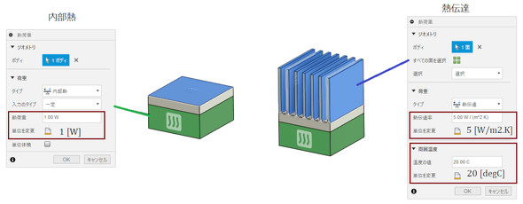 いよいよCAE解析です。図5に境界条件を示します。まず、発生熱として「内部熱」を1[W]とします。そして、伝熱界面の熱伝達率を5[W/m2.K]、周囲温度を20[degC]にしています。