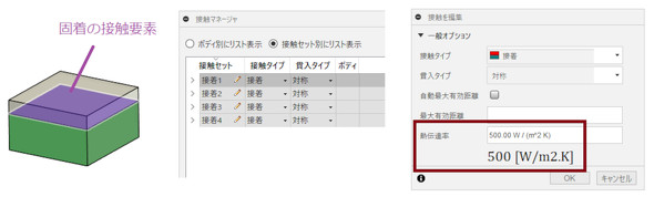 固体間には、接触要素を配置します。図6に接触要素を示します。ここでは接触抵抗の逆数を入力します。接触抵抗の逆数の適切な言葉がなかったのでしょうか、ソフトは「熱伝達率」と表示しています。ここでは500[W/m2.K]と入力しました。小さな値にしないと温度差が発生せず、温度分布の見栄えがよくないのでこうしました。