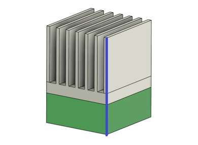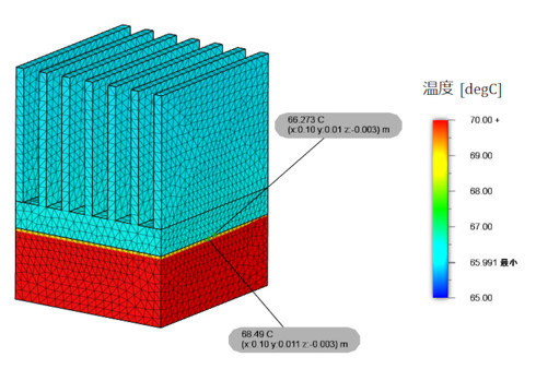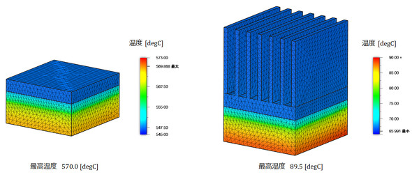 図7に温度分布の解析結果を示します。最高温度を表2の発熱体最高温度Tcと比較すると、表2の値とほぼ一致しました。前回の解説の中で、ヒートシンクを付けた場合、ひだひだがあるので図3のLs寸法が少し曖昧になり、「この件は後回しにする」と述べましたが、アルミの熱伝導率が他のものよりはるかに大きいので、ヒートシンク内の温度差がなくなっています。ひだひだ分の長さは考慮しなくてよいように思えます。