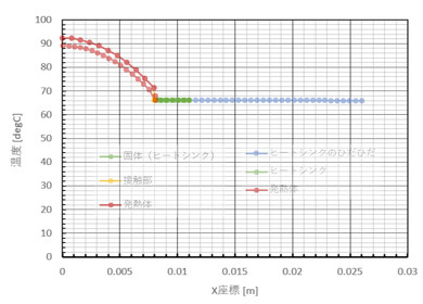 温度分布について、紙と鉛筆による方法とCAE解析による方法を詳しく比較しましょう。図9に示した温度評価位置について、CAE解析結果をテキストファイルで出力し、グラフにしました。これを図10に示します。両者の一致は「いい線いってる」で終わらそうとしましたが、もう少し細かく見てみましょう。