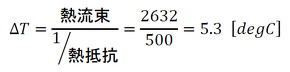 一方、紙と鉛筆による温度差は熱抵抗の定義から次式です(式2)。このΔTに違いが出たようです。式2の結果は、熱抵抗の定義に従った温度差なので間違う余地はないように思えます。