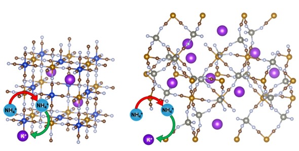 この平衡定数kが、CuPBは約8でした。これは、NH4+の方がK+より8倍吸着しやすいことを示しています。これは、CuPBが図2左図に示す立方晶の結晶構造をとることに由来しています。このPBの立方晶の結晶構造ではK+やNa+と比べて、NH4+の選択性が上がることが知られています[参考文献6]。