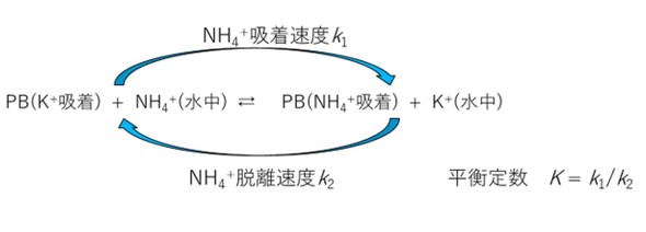 つまり、図3ではNH4+を吸着する速度「k1」がNH4+を脱離する速度「k2」よりどれだけ速いかを示しています。なお、K+以外のイオンはNH4+との平衡定数が極めて大きいため、選択性の議論の際に問題にはなりません。