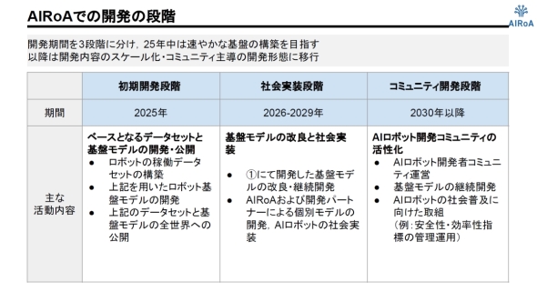 AIRoAは、2025年度の初期開発段階、2026〜2029年度の社会実装段階、2030年度以降のコミュニティー開発段階の3段階に分けて進めていく方針である。