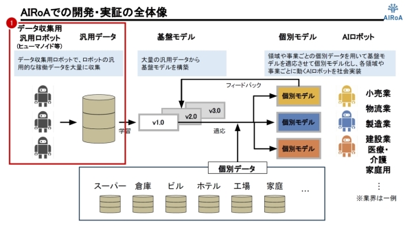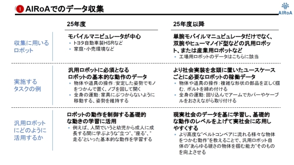 足元の2025年度における初期開発段階で行うのは、ベースとなるデータセットと基盤モデルの開発/公開である。正会員でありトヨタ自動車の「HSR(Human Support Robot)」などを用いた単腕のモバイルマニュピレーターを中心に、汎用ロボットに必須となるロボットの基本的な動作のデータを収集して、ロボットの動作を制御する基礎的な動きの学習に活用する。