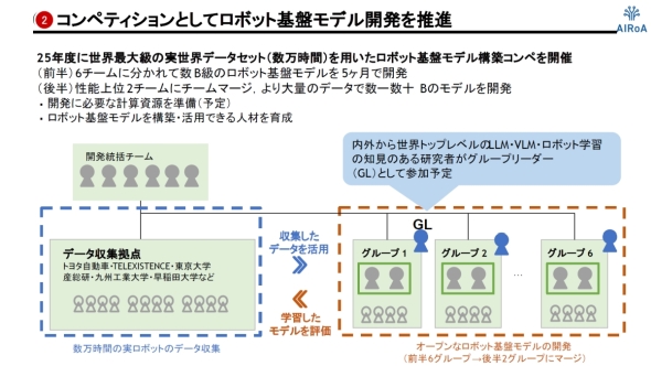 データ収集の拠点としては、トヨタ自動車やTelexistence、東京大学、産業技術総合研究所、九州工業大学、早稲田大学などを想定しており、2025年度の早い段階で数万時間の実世界データセットをそろえる方針である。この実世界データセットを用いた基盤モデルの開発はコンペティション形式で実施する。前半の5カ月は、6チームに分かれてパラメーター数が数十億(数B)級のロボット基盤モデルを5カ月で開発した後、鋼板は性能上位の2チームに6チームのメンバーを統合して、より大量のデータを用いて数十億〜数百億(数B〜数十B)級のロボット基盤モデルを開発する。尾形氏は「これまで日本国内でこれだけ本格的なデータ収集とロボット基盤モデルの開発は行われたことはない。コンペティション形式のよって早期に高い性能を持つロボット基盤モデルを開発し、グローバルかつオープンに公開する」と強調する。