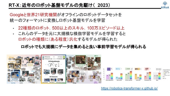 AIRoAが構築を目指す、ロボット基盤モデル開発の先駆けになったのが2023年にGoogleと世界の21の研究機関が参加して行われた「RT-X」である。