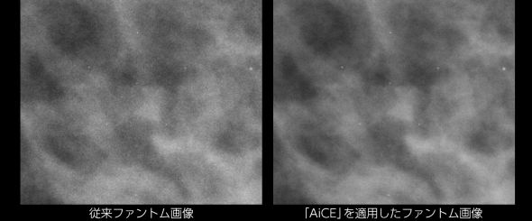 設計段階でマンモグラフィ臨床画像を用いたML(機械学習)を実行し、さまざまな条件でのノイズの特徴を学習しているため、必要な画像信号を維持しながら不要なノイズだけを効率的に除去できる。その結果、従来のノイズ低減処理と比べて最大約50%のノイズを低減する。また、画像の粒状感を抑えながら細部までくっきりと見えて、高いコントラストが得られるように、AiCEとその他の画像処理を最適化している。