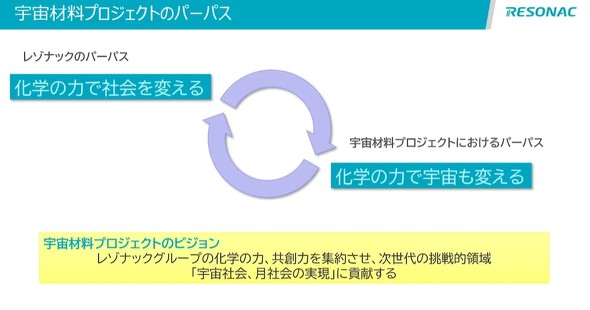 宇宙材料プロジェクトでは「化学の力で宇宙も変える」という独自のパーパスも定めている。レゾナックグループの化学の力、共創力を集約させ次世代の挑戦的領域である「宇宙社会、月社会の実現」に貢献することを目指す。