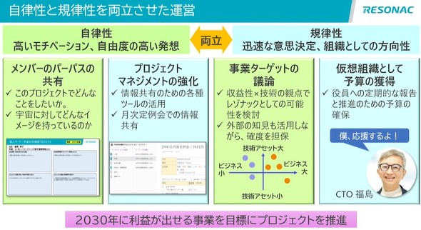 同プロジェクトの特徴としては、有志メンバーの取り組みにおいて自律性と規律性を両立させた運営を掲げている。従来のような与えられたテーマをこなすといよりも、高いモチベーションや自由度の高い発想をもとに自ら仕事を作り出すことを重要視する。さらに迅速な意思決定、組織としての方向性を決められるような規律性を併せ持つ体制とした。取り組み方としてはメンバーのパーパスの共有、プロジェクトマネジメントの強化、事業ターゲットの議論、仮想組織として予算の獲得を行っている。2030年には利益が出せる事業へと育っていることが目標だ。