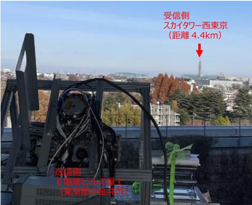 周波数帯は95.375〜96.625GHzに限定して、送信機の空中線電力は15mWに設定し、東京都小金井市と西東京市の間で伝送試験を実施した。その結果、4.4kmの距離に対して、QPSK方式で2Gbps、16QAM方式で4Gbpsの通信を確認した。