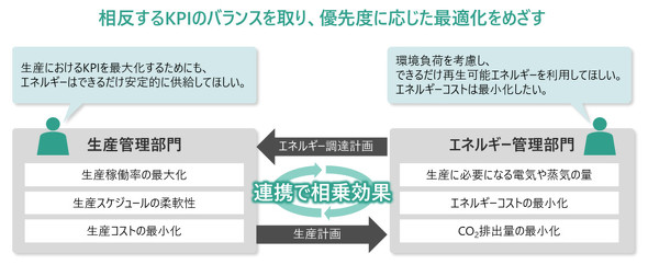 エネルギー使用量の変動や契約電力の制約を考慮しながら、生産とエネルギー双方の計画に対してAIが調整案を提示する。例えば、例えば、契約電力の上限を超過しないように全体の生産計画を最適化したり、化学反応器で発生する高温の廃熱を回収して蒸気を生成して他のプロセスに共有したりするなど、生産量の変動に追従しながらエネルギー消費量の低減を図る