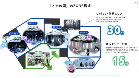 ノモの国は、おおよそ30人を1グループとして、Unlock体験エリアを約30分、展示エリアの大地を約15分で観覧することを想定している。1時間当たり8グループのペースで入場案内を行う予定だ。入場を希望する場合にはWebサイトから事前に予約することになるが、大阪・関西万博では当日券も販売されるため、事前予約以外の当日対応を行うことも検討しているという。