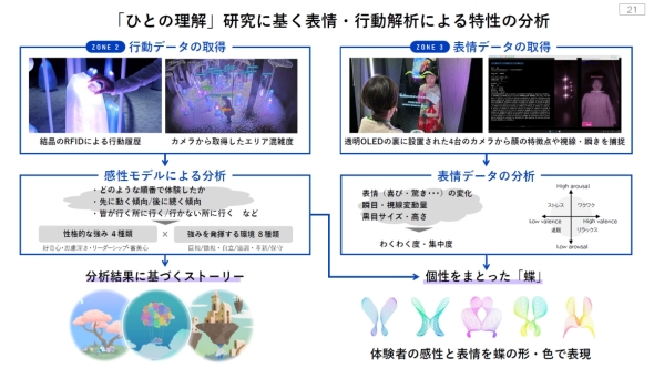 ZONE3の「古木の谷」では、各来場者に分類した感性モデルに基づくストーリーの映像を透明OLEDを使って見せている間に、裏側に設置した4台のカメラから表情データを取得して分析を行う。最終的に来場者は、先述した感性モデルとこの表情データに基づく個性をまとった「蝶」を見ることができる。この蝶は百数十種類のパターンがあるという。