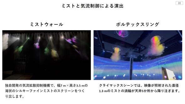 ZONE3からZONE4の「大空へ」の間には、独自開発の気流拡散抑制機構で幅7×高さ3.5mの滝状のシルキーファインミストがあり、ZONE4に向かうにはこの滝に向かって勇気をもって一歩を踏み出す必要がある。滝を抜けた先のZONE4は、インタラクティブなイマーシブシアターになっており、クライマックスシーンでは映像が照射された直径1.3mのミストの渦輪が天井5カ所か降り注ぐ演出などが行われる。