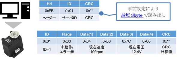 BLA21-12R3-C01は、2024年11月1日に発売した、小型かつ高トルクの産業用サーボモーターだ。今回のアップデートでは、新開発したプロトコル「CM.BUS」を追加し、サーボ制御の高速化を可能にする。サーボ内部で書き込み用と読み取り用のデータを事前に記録、指定し、送信時のヘッダデータと関連付けて必要なデータ量を最小化することで、データ伝送効率が最大60%向上する。